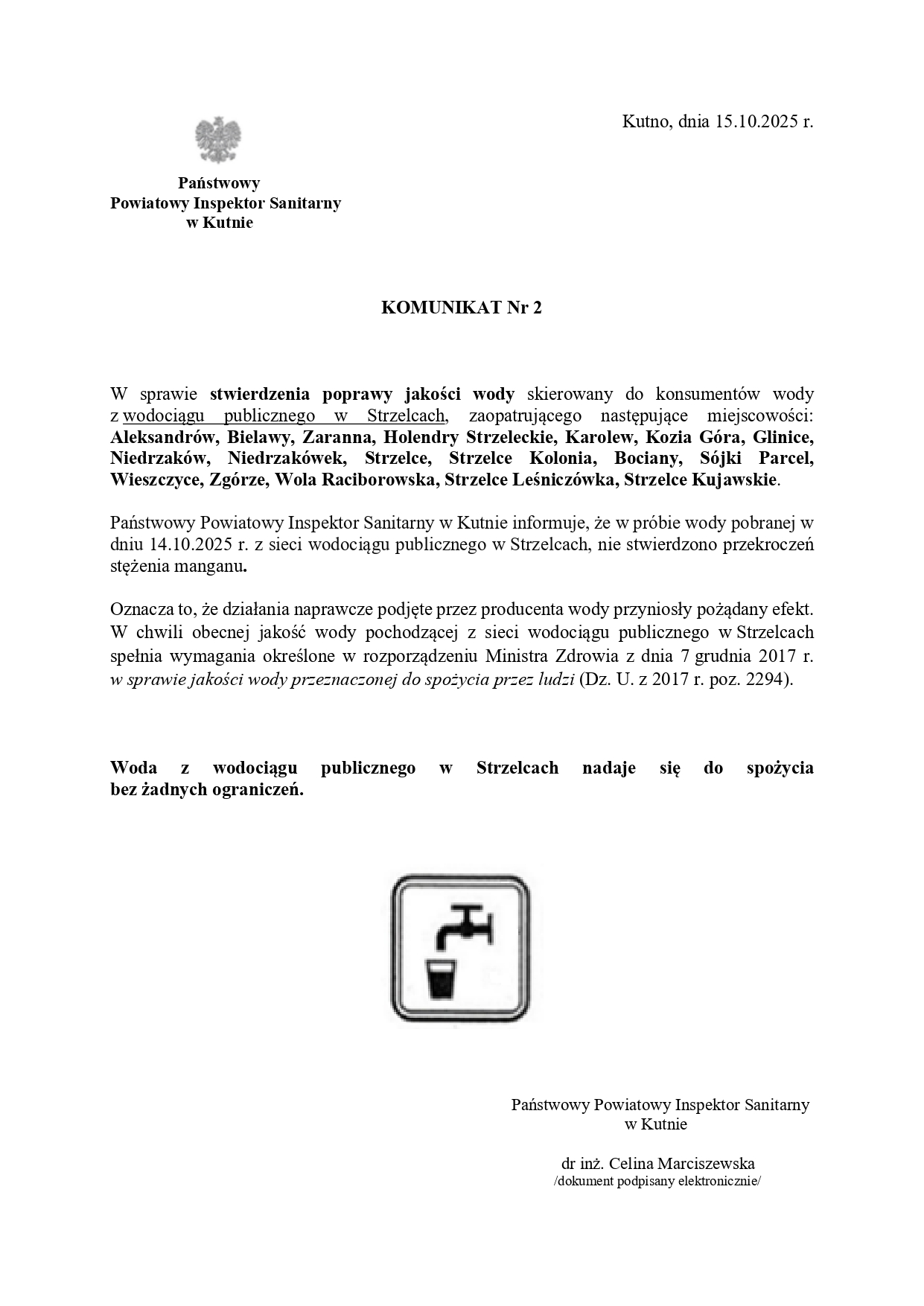 KOMUNIKAT Nr 2 w sprawie stwierdzenia poprawy jakości wody po przeprowadzonych działaniach naprawczych skierowany do konsumentów wody z wodociągu publicznego w Strzelcach.