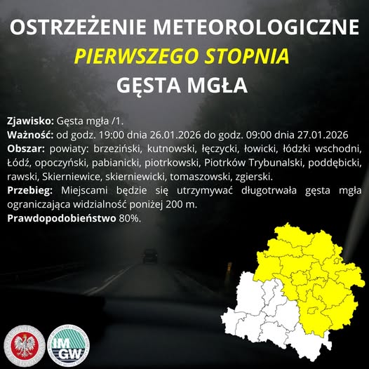 Instytut Meteorologii i Gospodarki Wodnej – IMGW PIB wydał ostrzeżenie meteorologiczne I stopnia dot. gęstej mgły‼